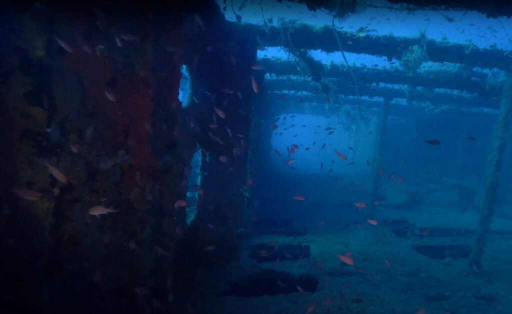 - Poppa: Presenta una grande ruota del timone perfettamente conservata, ricoperta di spugne e alghe, con un’ancora di rispetto di tipo ammiragliato alla base. Sotto la poppa, l’elica a tre pale emerge parzialmente dal fondale sabbioso.